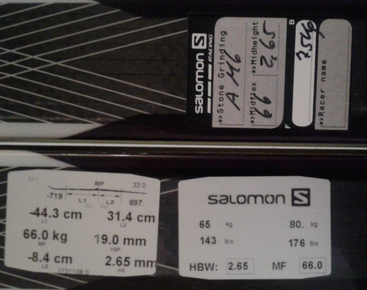 На наклейке лыж с дополнительными промерами указаны все промеры: