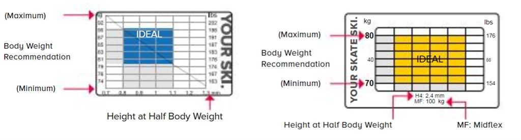 Разница стикеров классических (слева) и коньковых (справа) лыж. У классики широкий допустимый диапазон работы лыж, а цветная область — идеальный вес. У коньковых лыж рекомендуемый диапазон веса уже и ограничен цветной областью.