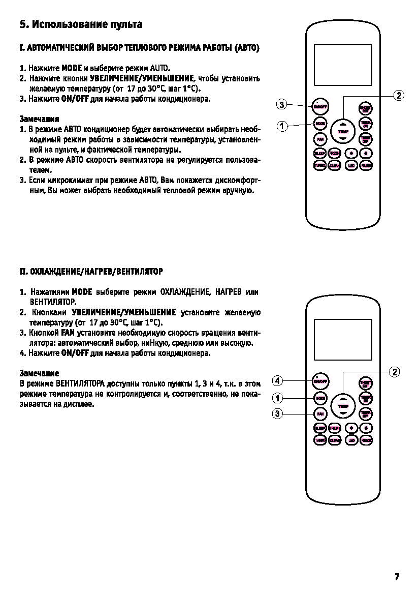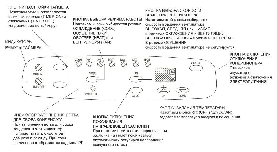 – выбор режима (автоматическая работы, холод, осушение, тепло, вентиляция)