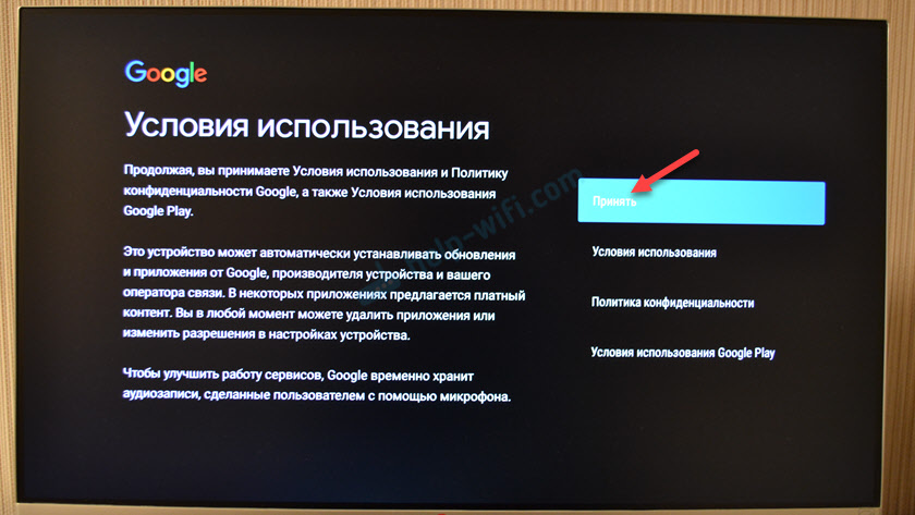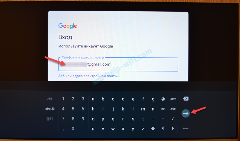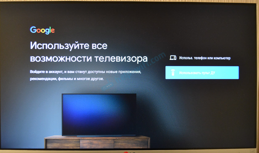 Дальше нам предложат выполнить вход в аккаунт Google. И я настоятельно рекомендую это сделать. Чтобы была возможность пользоваться всеми функциями. Автоматически будет выполнен вход в аккаунт YouTube. Так же вы сможете устанавливать приложения из Play Маркет. В принципе, этот шаг можно пропустить и зайти в свой аккаунт Google позже в настройках, но я рекомендую сделать это сразу.