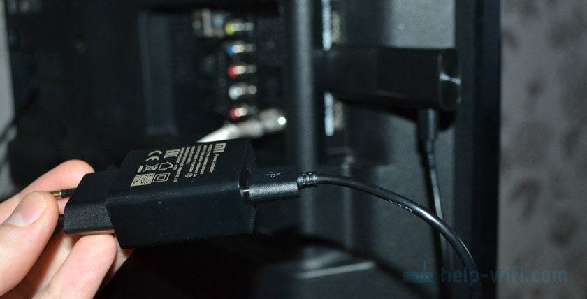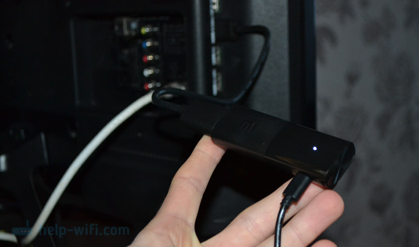 Если после включения телевизора индикатор на Mi TV Stick не горит и она не работает (у меня на фото индикатор не горит, так как телевизор был выключен), то подключите питание от розетки (через адаптер, который идет в комплекте)