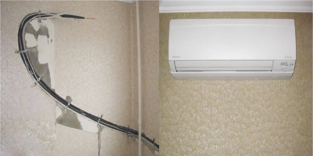 Далее, необходимо подготовить желоб и отверстие в стене подходящего диаметра. При расчете размеров стоит учитывать то, что коммуникации будут соединены между собой изолентой и пластиковыми стяжками, а медные трубки будут теплоизолированные.