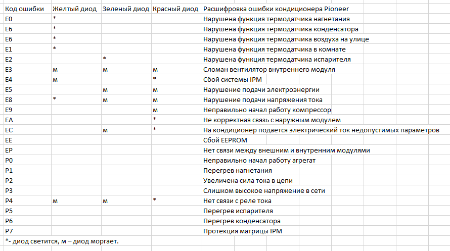 | Код ошибки кондиционера Пионер | Желтый диод | Зеленый диод | Красный диод | Расшифровка ошибки кондиционера Pioneer |
