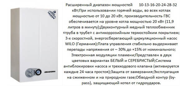 Данные устройства являются двухконтурными, рассчитаны на отопление помещения и снабжение его горячей водой для бытовых нужд. Температура нагрева жидкости колеблется в пределах 35-60 градусов, пропускная способность горячего водоснабжения 10 литров за минуту.