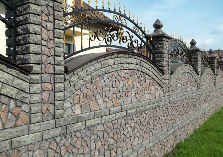 - Равное соотношение кирпича и металла. При этом нижняя часть ограждения (1-1,5 м) и столбы выполняются из кирпича, а между колоннами располагаются кованые элементы.