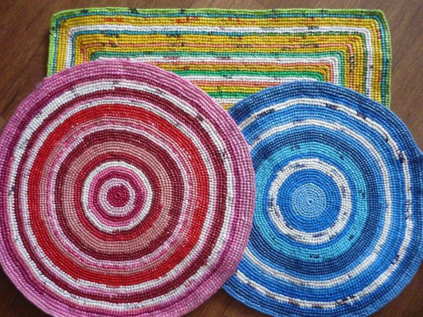 Вязаные – коврики прямоугольной, круглой или овальной формы, связанные крючком или спицами. Чтобы придать им объем, в качестве материала используют не только нитки, но и полоски из любой не сыпучей ткани.