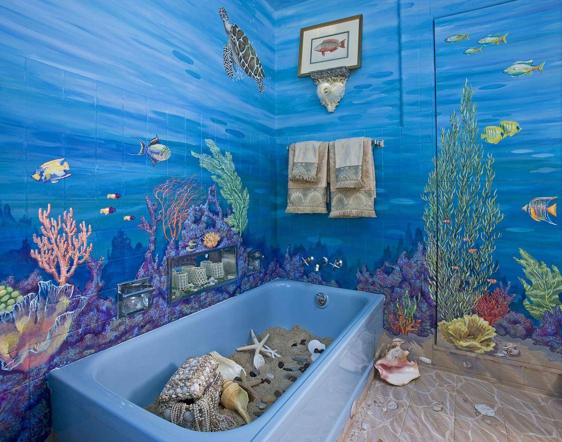 При выборе моющихся 3D-обоев рекомендуется сделать так, чтобы полотна занимали всю стены. Изображению не должны мешать трубы, полки и другие сантехнические и декоративные элементы. Если ванная комната небольшая, то изображение может быть представлено небольшой яркой картиной.