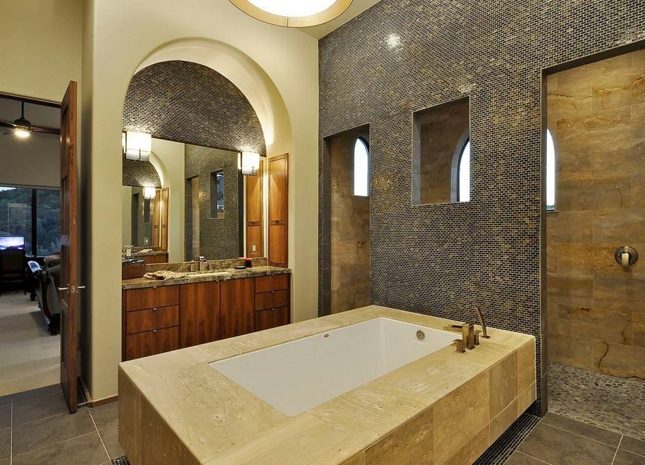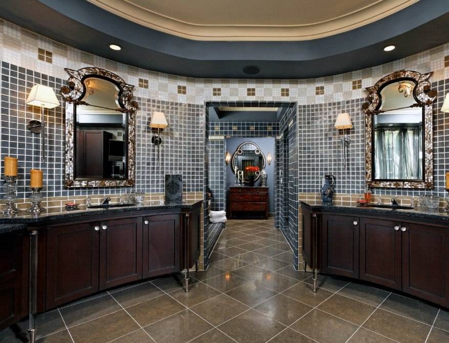В качестве напольного покрытия дизайнеры чаще всего применяют керамогранит, мрамор, травертин, керамическую и мозаичную плитку. Иногда можно встретить и паркетные вариации, однако в таком случае следует тщательно защищать плоскость от воздействия влаги и жидкостей. Компромиссный вариант – плиты с имитацией древесного рисунка.