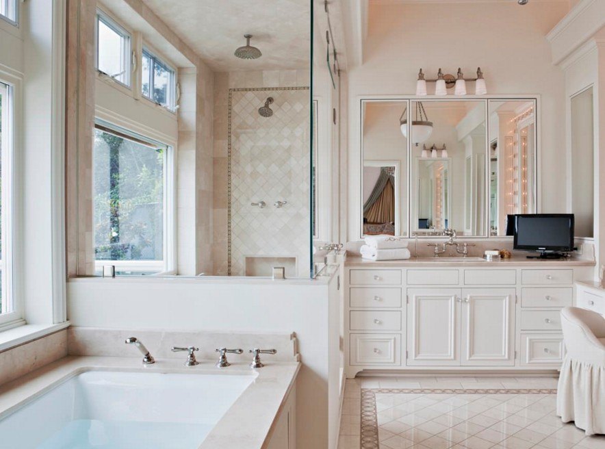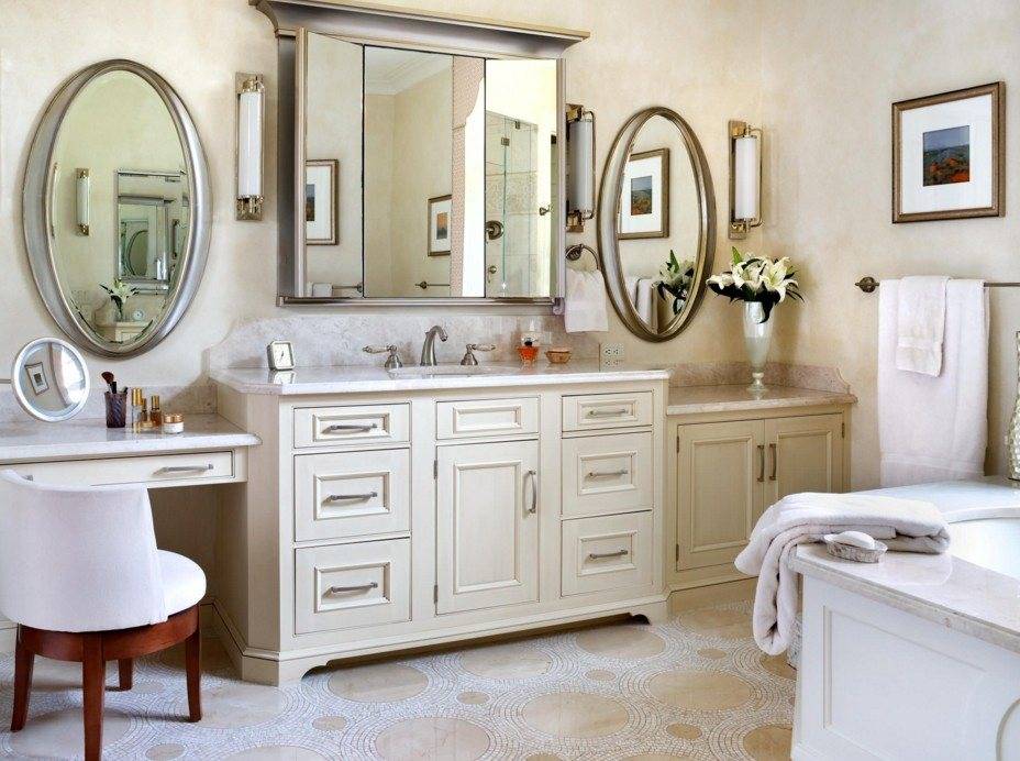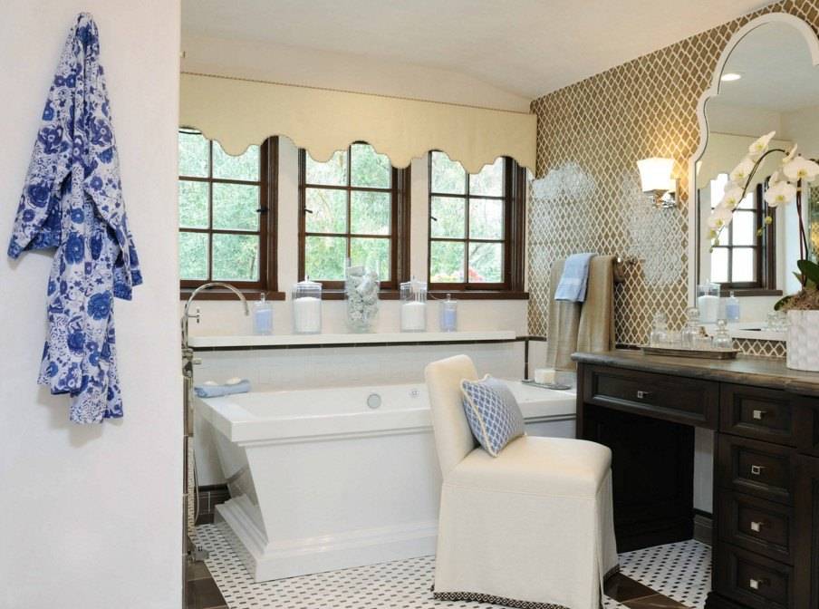 Это классический стиль, предполагающий использование светлых нежных тонов. В последнем могут помочь плитка с художественным панно, изящное обрамление зеркала, подвесные светильники, имитация фактуры камня на тумбе или плитке.