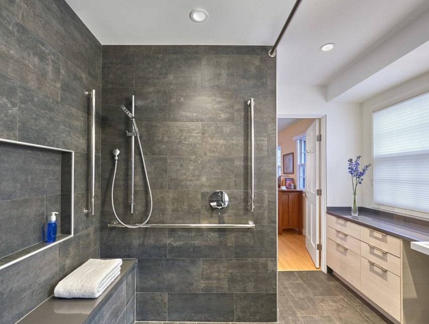Приветствуется сочетание строгих форм и высокой функциональности мебели и оборудования. Если позволяют средства, можно установить в помещении кабину для душа с гидромассажем.