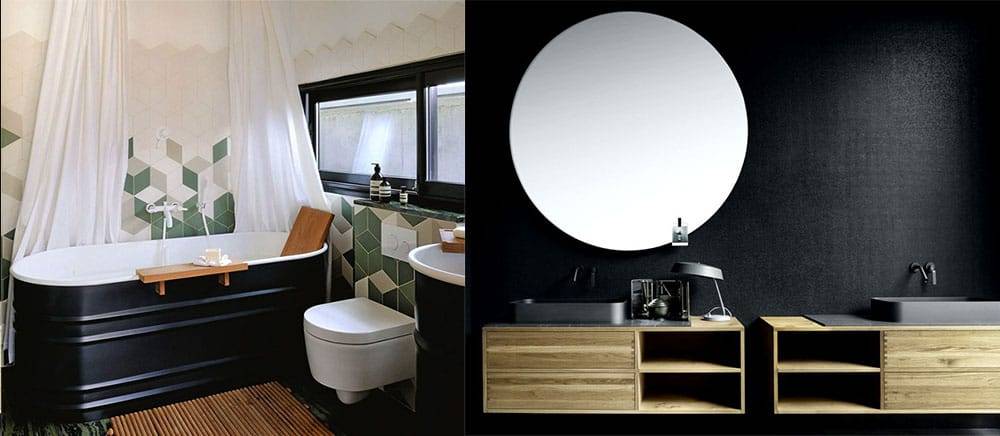 Черный и любой темный оттенок стали становятся невероятно популярными. Черным меняет амплуа: все чаще он выступает не только в качестве фонового цвета, но и в главных ролях! Светлые элементы визуально выступают вперед благодаря черному. Эту особенность стоит , использовать для акцентирования какой-либо светлой мебели или элементов декора ванной 2018 года.