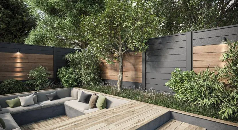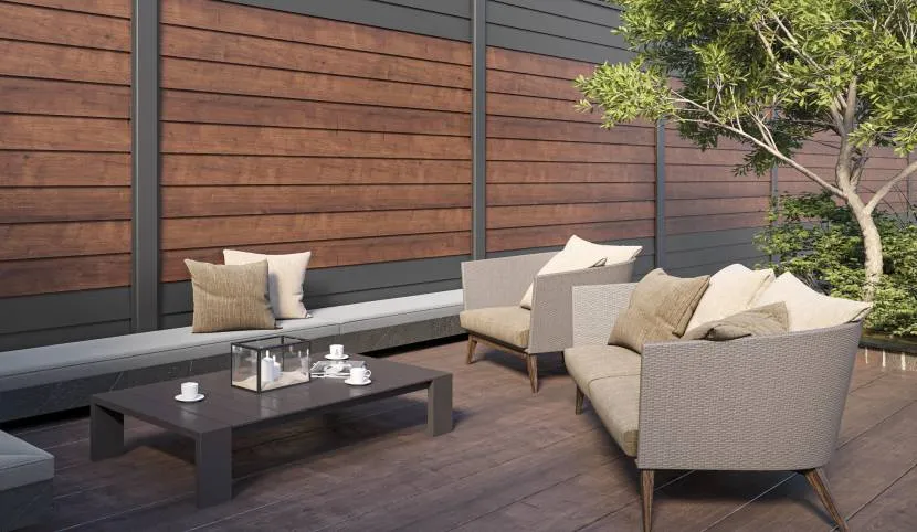 Штакетник монтируется вертикально или горизонтально с зазорами. Современный и стильный вид изгороди придают ламели, прикрепленные горизонтально с просветом различной ширины.