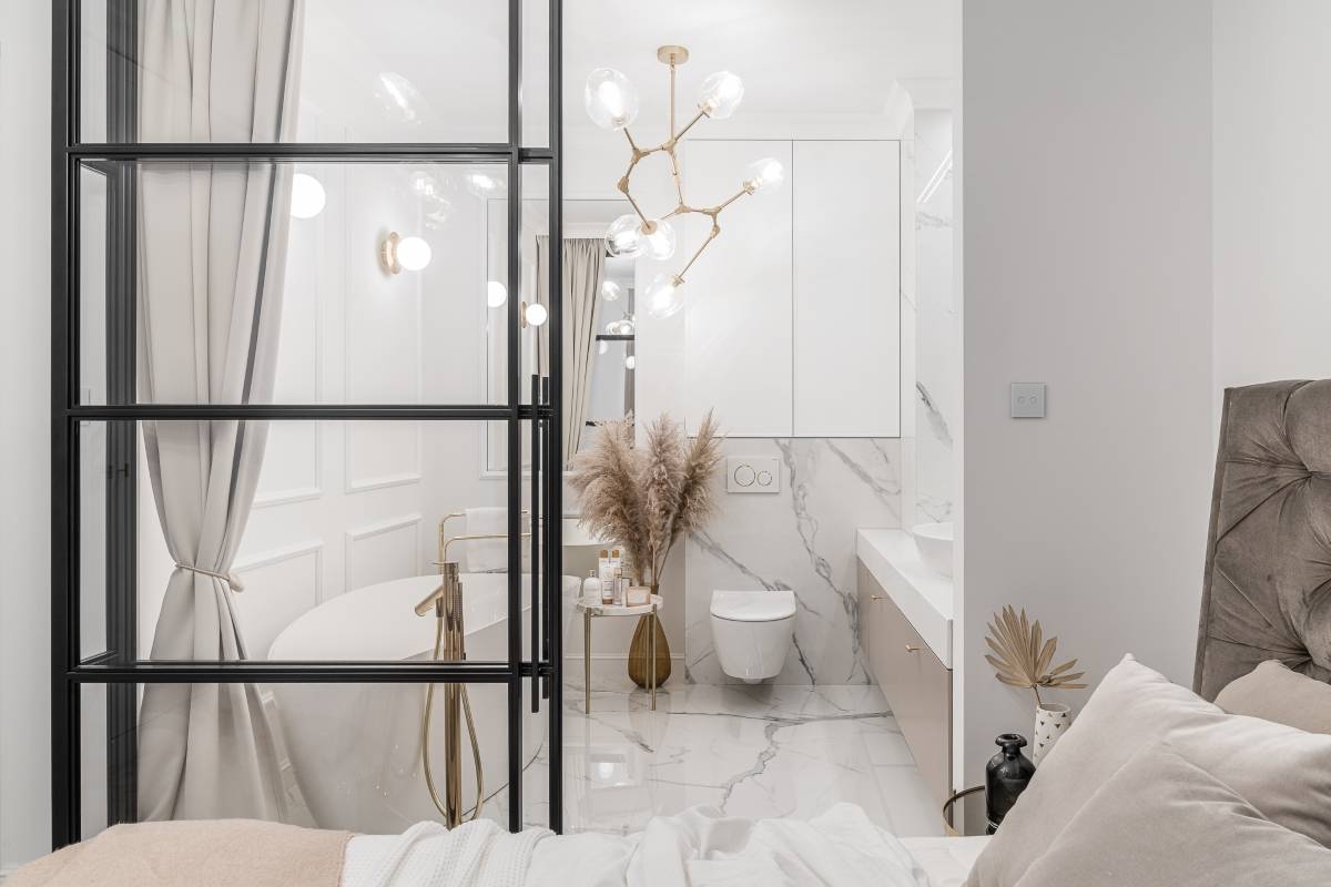 К этому проекту, безусловно, предъявлялись высокие требования. В этом случае ванная комната представляет собой одно пространство со спальней. Их разделяет только остекление. В такой ситуации санузел должен визуально сливаться с сопровождающим его помещением.