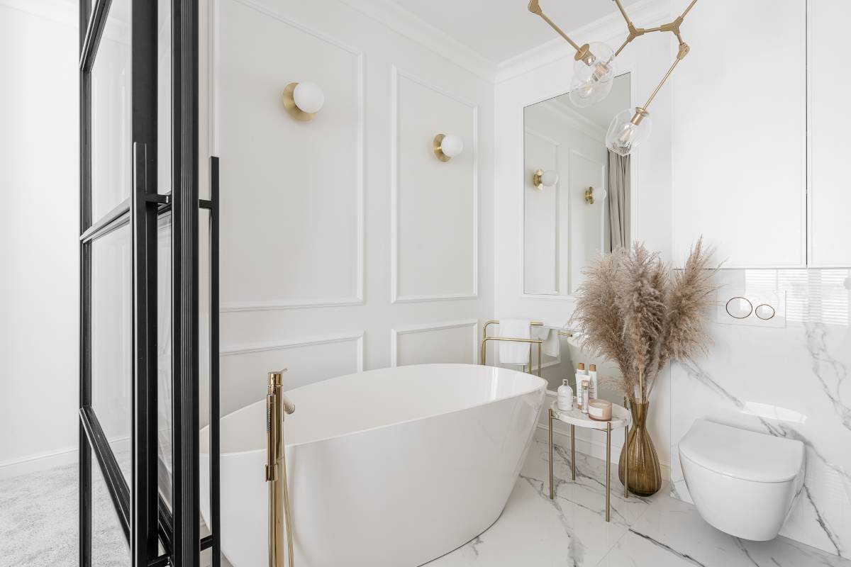 В дизайне преобладают мрамор, бежевый и золотой. Лепной интерьер добавляет еще элегантности. Пампасные травы в тонированном стекле — хит этого сезона. Как видим, эта стихия природы прекрасно вписывается в элегантные комнаты прямо из парижских многоквартирных домов.
