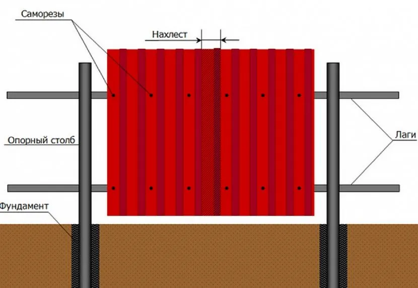 Они должны быть углублены не менее чем на 30% от общей высоты. Обычно расстояние между стойками составляет 2-3 м. Хотя в длину профилированных листов или сборных сварных секций можно вносить корректировки.