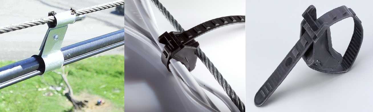 Для крепления кабеля к кабелю используются специальные металлические и пластиковые крючки. Они состоят из двух частей: отверстие для кабеля и отверстие большего размера для прокладки кабелей.