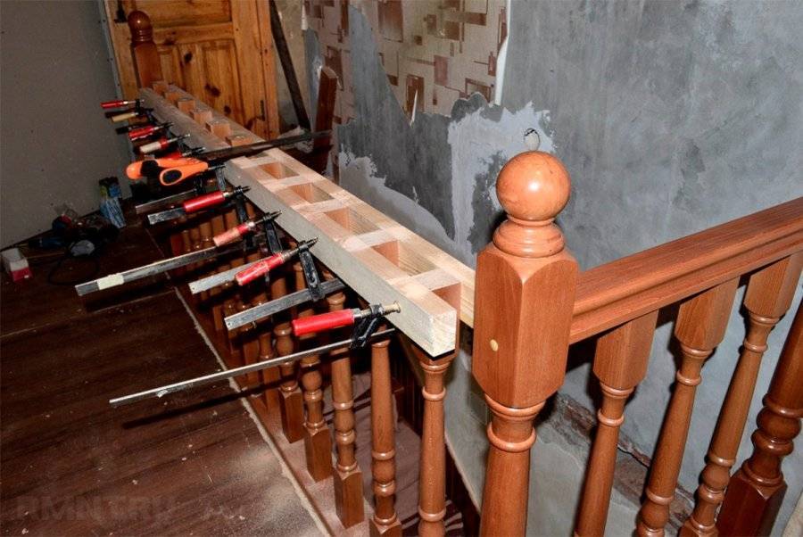 - Снимают струбцины. Крепление поручня окончено, перила готовы к эксплуатации.