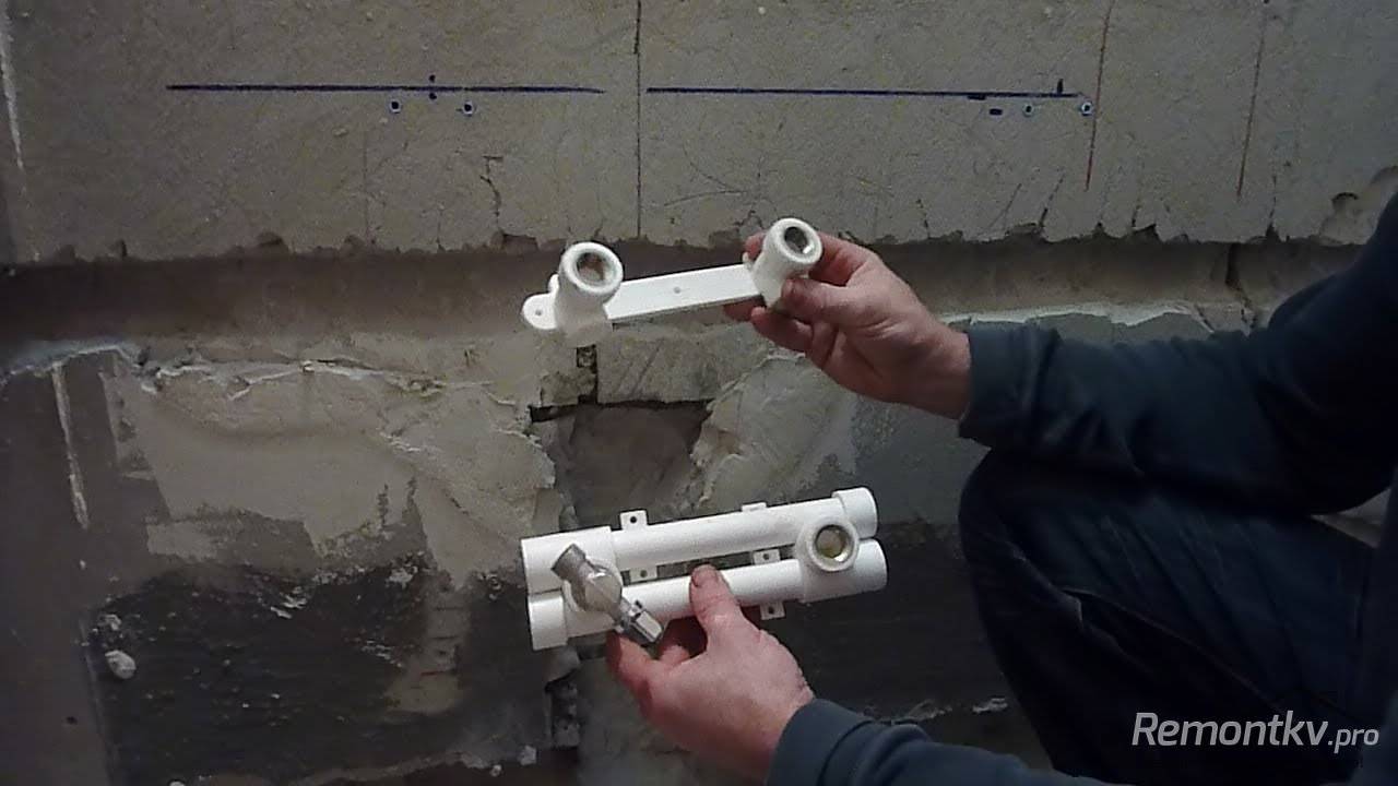 Планка крепится в выбранном месте с помощью пластиковых дюбелей и саморезов, вкручиваемых через имеющиеся отверстия. Деталь припаивается к трубам из полипропилена и фиксируется в стене таким образом, чтобы ее внешний край утопал в строительной конструкции.
