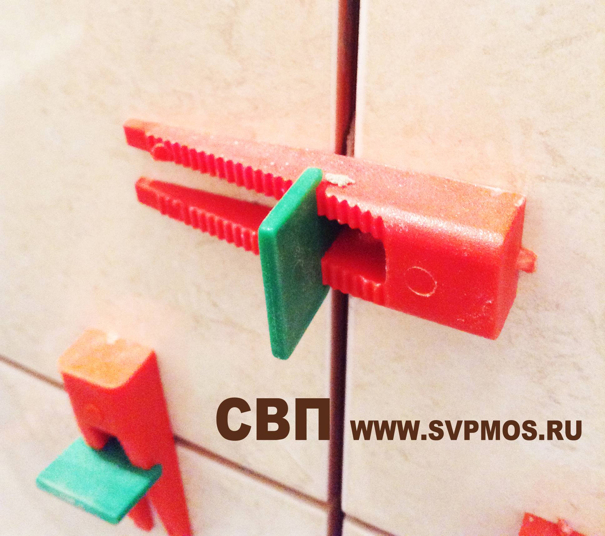 - Система выравнивания плитки (СВП). Иногда её называют 3D крестики, потому что они выравнивают плитки не только по длине и ширине, но и равномерно прижимают их, не дают проседать в процессе высыхания клея. Получаются равномерные швы 1,8 мм.