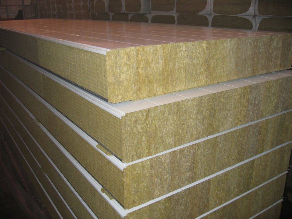 Более тяжелый утеплитель. Для изготовления панелей применяется базальтовая минеральная вата с повышенной плотностью волокна. Минеральная вата впитывает воду и нуждается в дополнительной защите. У неё низкий коэффициент теплопроводности и высокие показатели по звукоизоляции.