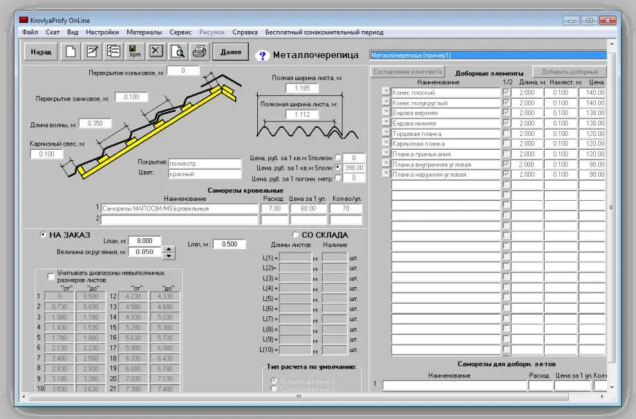 Металлочерепицу сейчас фактически никто не стелет без дополнительных профилей, что производители предлагают для комплектации коллекций. Это конек, карниз, планки на фронтон или нижняя, верхняя ендова, снегозадержатели. Количество этих элементов также можно рассчитать с помощью калькулятора для металлочерепицы на крышу. Если самостоятельно определять расход, то планки, как правило, поступают в продажу длиной до 2 метров и здесь нахлесты соблюдаются всего на 100 мм. То есть, например, торцевых профилей понадобится (18*2)/1,9=18,9 или 19 штук на каждую сторону.