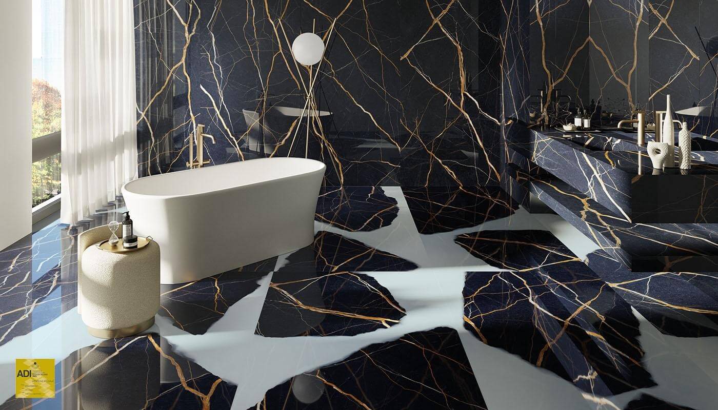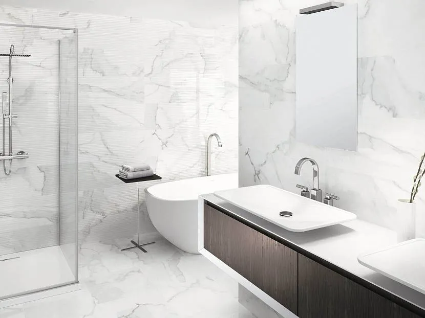 - Простой уход. Керамическая поверхность противостоит царапинам и воздействию химических средств. Кроме того, керамогранит впитывает меньше влаги, чем натуральный аналог (влагопоглощение 0,05–0,5%). Керамогранитная плитка под мрамор оптимальна для ванной, кухни и других помещений с повышенной влажностью.
