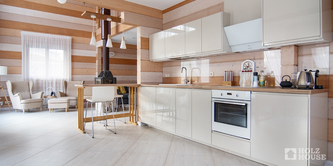 Если хочется подобрать более бюджетный вариант, можно обратить внимание на экономичные заменители – например, ламинат, имитирующий натуральную древесину, пробковое покрытие, линолеум. Напольное покрытие в кухне можно использовать для зонирования помещений. Если большая часть общего пространства покрыта дощатым полом, то на кухне можно положить плитку или выделить ее ламинатом, чтобы граница между зонами была более выраженной. Стены из клееного бруса, как правило, оставляют в первозданном виде