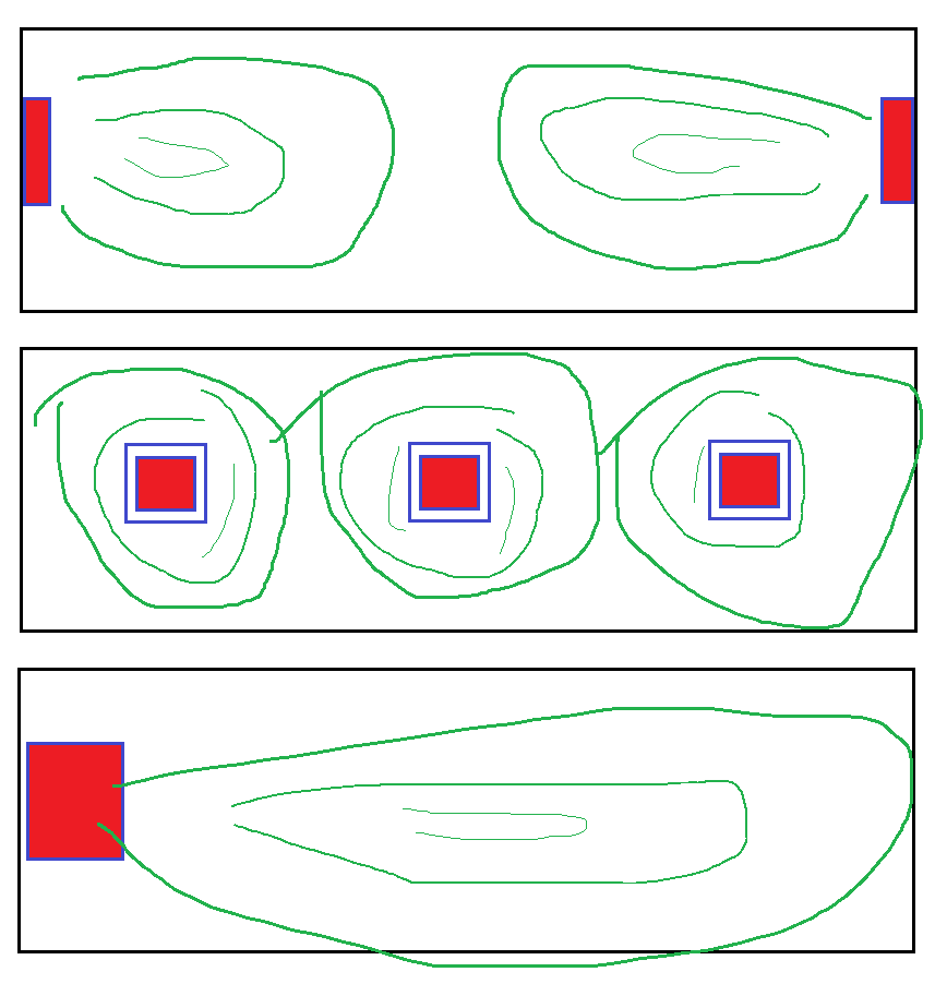 В первом случае распространение воздушных масс идет вверх вдоль стен, во втором – горизонтально вдоль потолка. В обоих ситуациях холодный воздух не направляется прямо на находящихся в помещении людей.