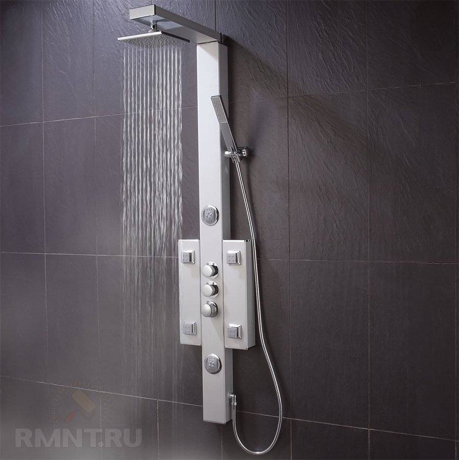Благодаря душевой панели можно пользоваться верхним закрепленным душем или ручной лейкой. Стойка крепится на смеситель, которая одновременно используется для подачи воды в верхний душ. Душ-лейка крепится внизу с помощью гибкого шланга. Данные системы широко применяются в маленьких ванных комнатах, благодаря тому, что такая стойка экономит пространство и используется в двух назначениях.