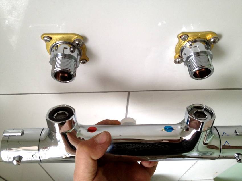 Установка выполняется следующим образом. Монтаж начинается со смесителя. Трубы для горячей и холодной воды должны находиться на одном уровне, иначе стойка будет установлена криво. Правильность расположения самого смесителя обеспечивает планка, которая идет в душевом комплекте. Подключается смеситель при помощи уголков, которые крепятся к планке винтами. Далее смеситель соединяется с трубами посредством резьбовых частей. Для резьбы обязательно применяется уплотнительная обмотка.