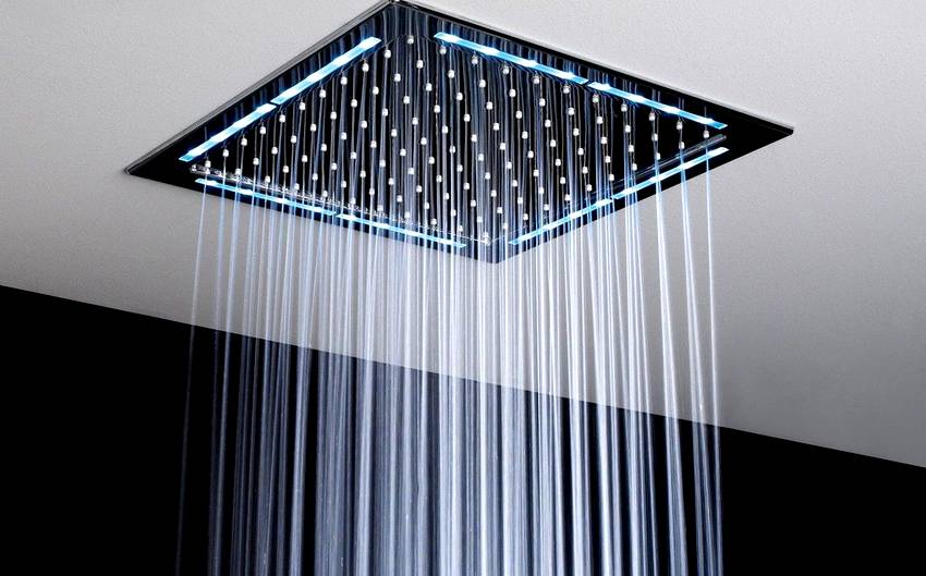 В ванных комнатах можно установить лейку для тропического дождя квадратной, прямоугольной или круглой формы. О тропическом дожде можно говорить тогда, когда размер стороны устройства составляет около 20 см, при этом у больших моделей он может достигать 60 см. Для круглой лейки мы говорим о диаметре (размеры аналогичны). Некоторые модели ливневых дождей могут иметь лейку, наклоняющуюся в необходимом направлении и освещение. Дорогие модели также могут быть оборудованы термостатом, подсветкой и другими функциями.
