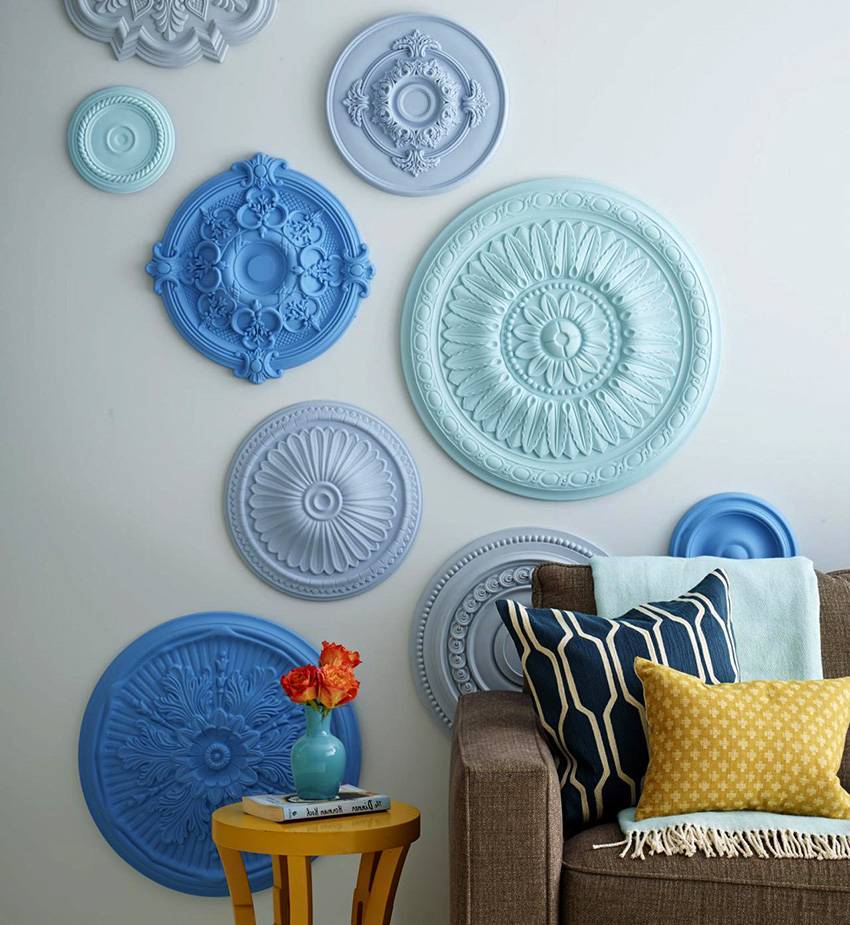 Используя различные виды элементов и комбинируя их между собой, можно создавать оригинальные и красивые композиции. Также лепнина из этого материала нередко используется в качестве финишного акцента при декорировании стен в помещении, аккуратно разделяя зоны между собой.