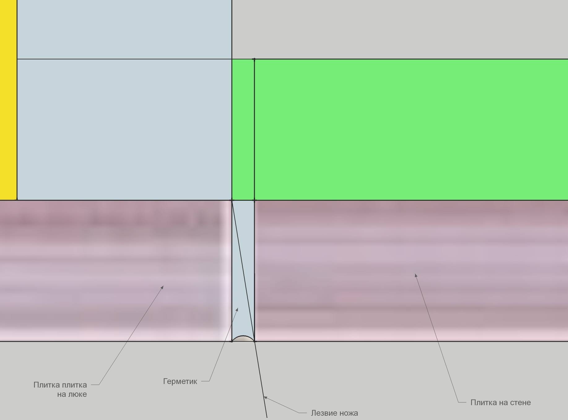 Первым делом необходимо, по периметру с обеих сторон люка, обклеить шов монтажным скотчем, как показано на рис. 10. Скотч необходимо приклеивать максимально близко к кромке плитки, чтобы в дальнейшем герметик не попал на лицевую часть плитки.