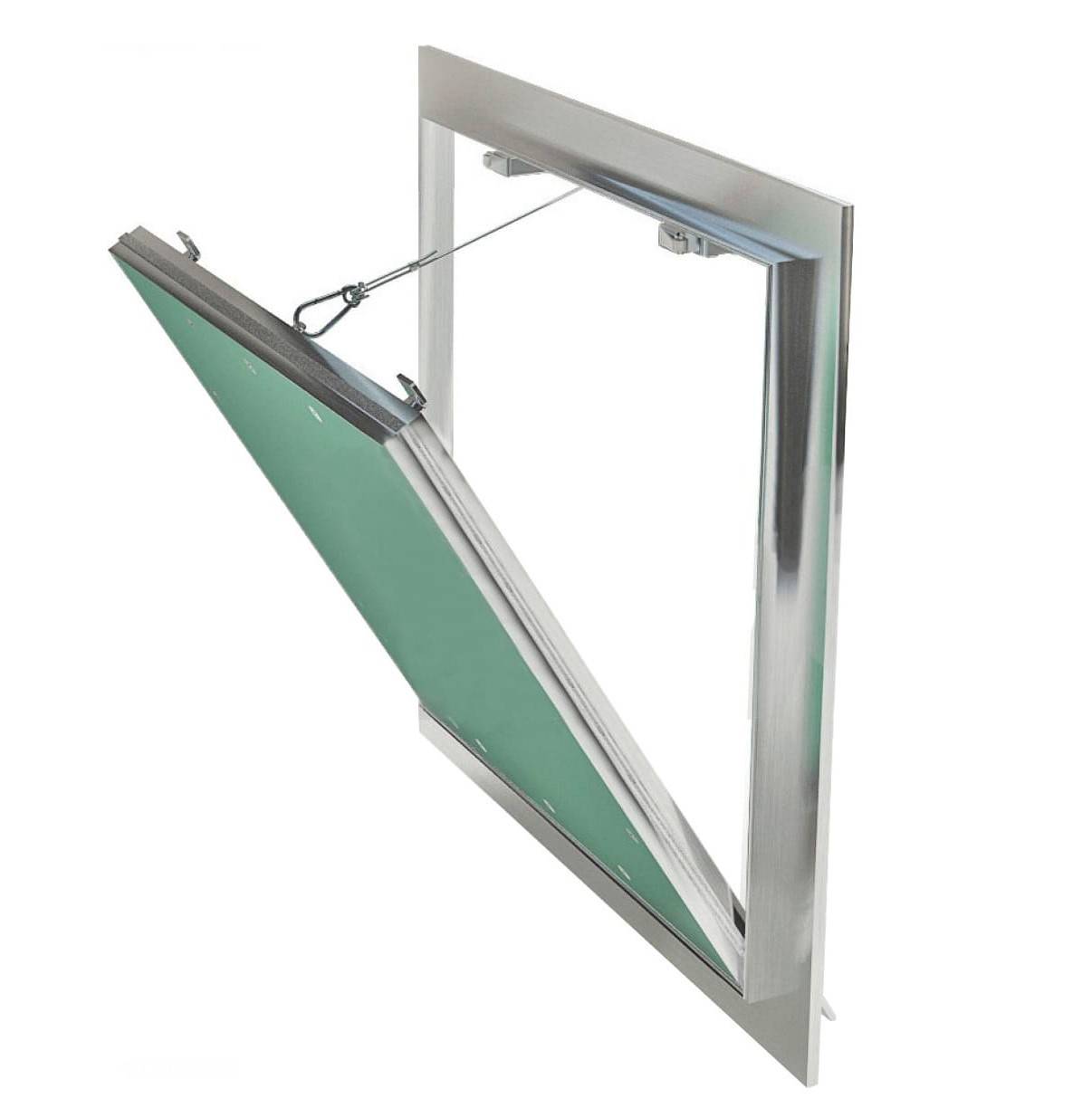 Если проем ревизионной ниши расположен на гипсокартонной перегородке или фальшстене, то стоит отдать предпочтение облегченной откидной конструкции на алюминиевой раме.