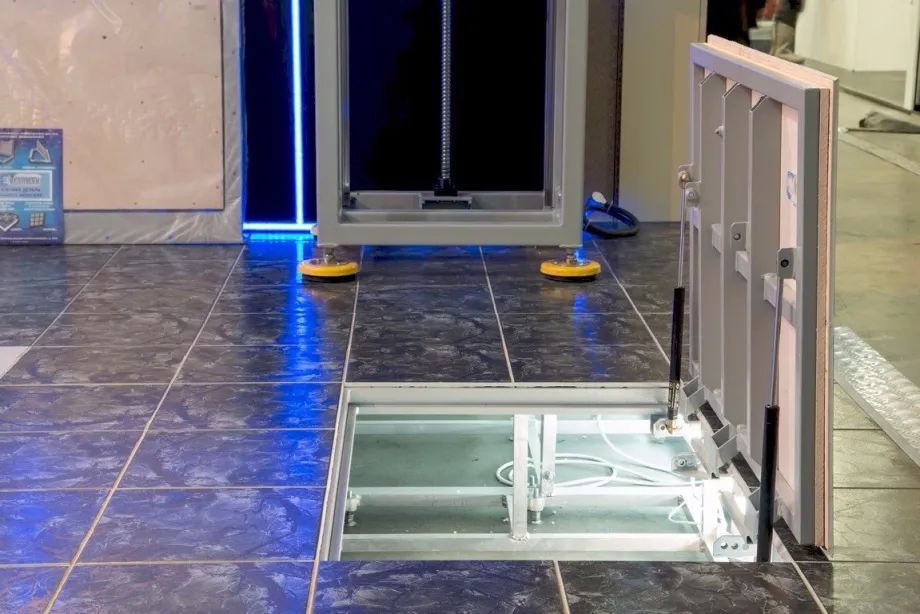 Вкратце процесс выглядит так: создается металлическая основа, на нее укладывается плитка с расчетом совпадения соседних с люком элементов пола.