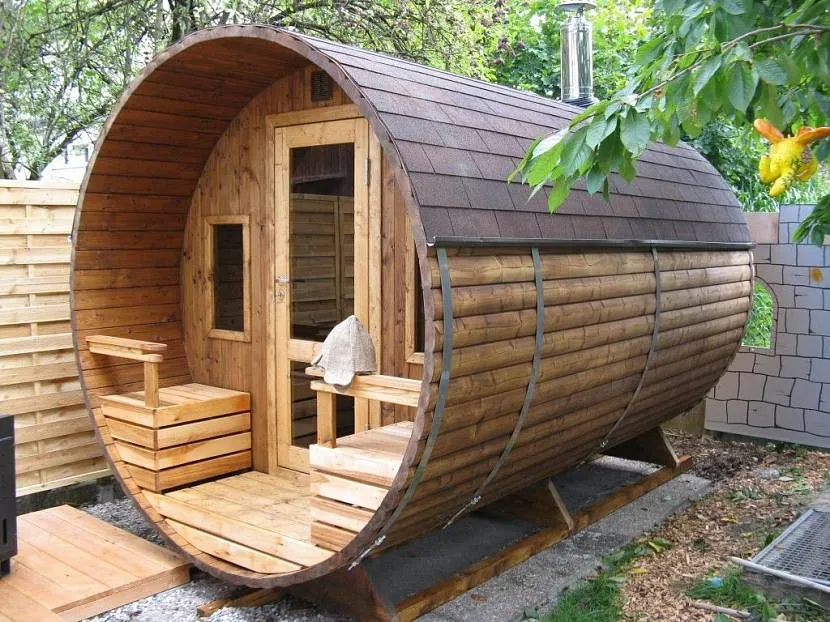 Подобное строение представляет собой габаритную бочку, изготовленную из древесины. Она разделена специальной перегородкой на две функциональные зоны: парную и душевую – для проведения оздоровительных и водных процедур, предбанник – для монтажа отопительного оборудования. Мобильная бочкообразная баня способна вместить от 2 до 4 человек за один сеанс.