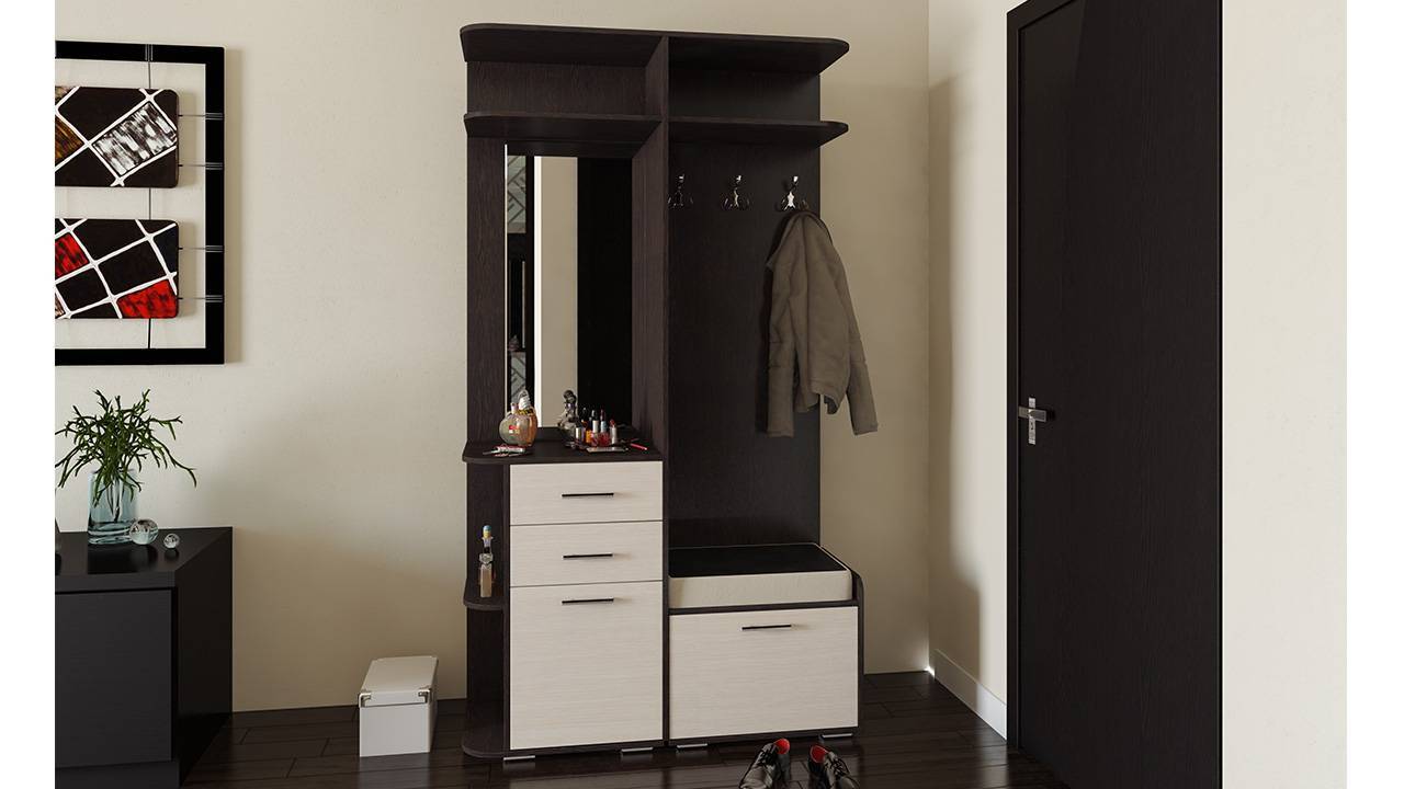 Вариант компактной прихожей с обувницей, зеркалом и вешалками.