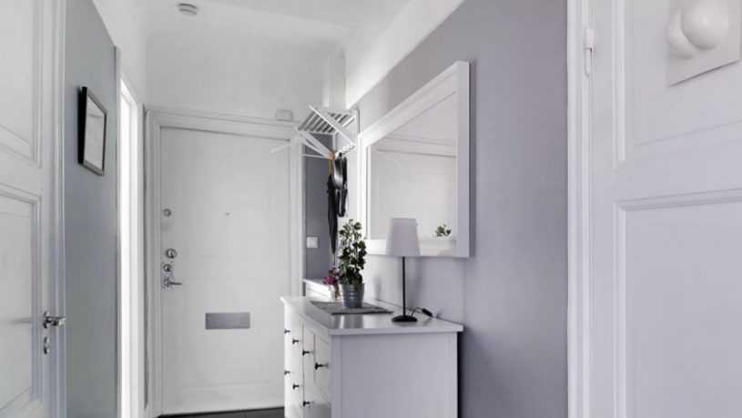 Принципы минимализма хороши для небольшого прохода. Выбирайте для отделки стен базовые оттенки, без узоров и фактур. Декор используйте по минимуму; шкафы старайтесь выбирать встроенные, чтобы не резать пространство.