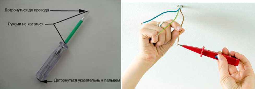 Определить назначение проводов поможет отвёртка с индикатором, с помощью которой без труда можно найти ноль и фазу. В процессе проверки необходимо оставлять разметку, чтобы в будущем не перепутать назначения проводников.