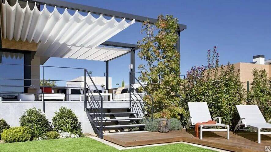 В этом случае маркиза и пергола для террасы – 2 элемента в одном. Обычно применяется для покрытия большой площади участка рядом со зданием.