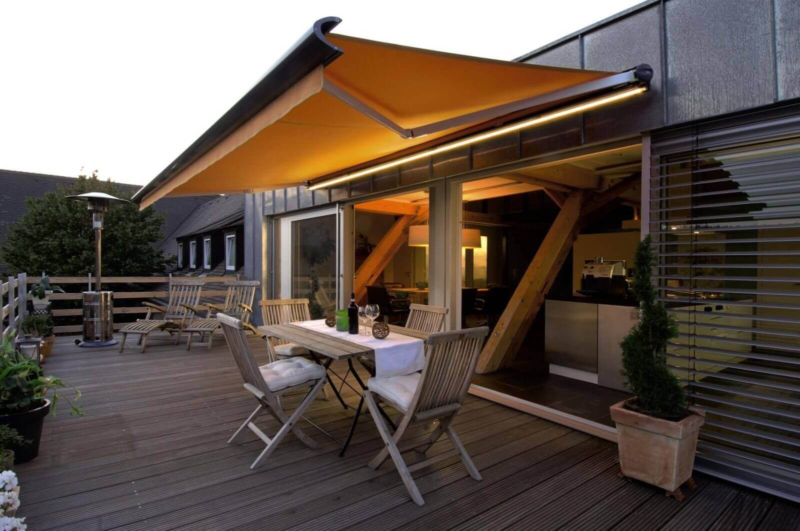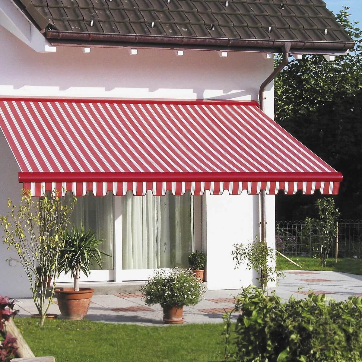 Фото: раскладная маркиза, затеняющая большую площадь — незаменимый аксессуар для террасы
