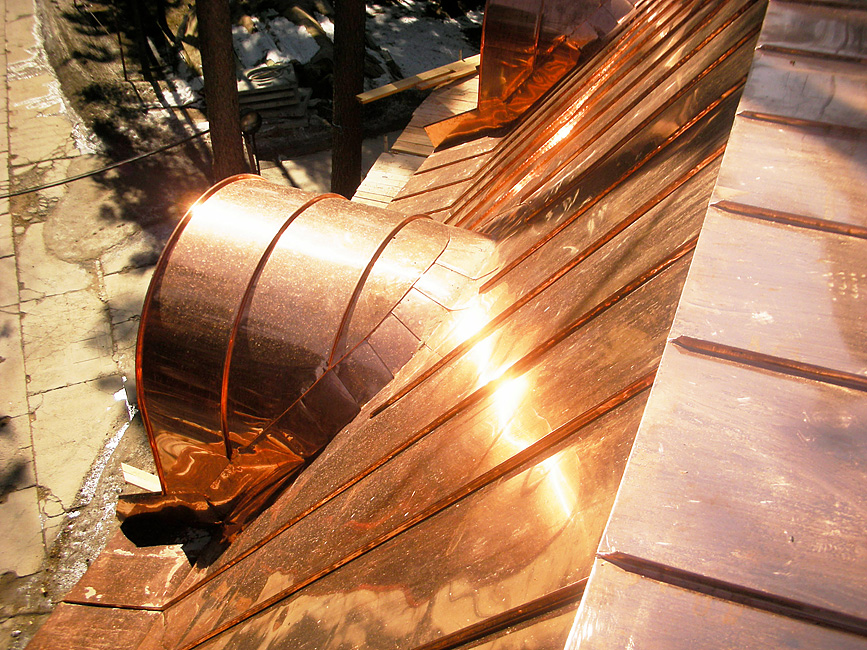 Легче, чем сталь, мягкий, гибкий и красивый металл. Пока кровля новая, она просто сияет на солнце. Со временем покрывается оксидной плёнкой (патиной) — приобретает коричневые, а затем зелёные оттенки. Гибкость металла позволяет использовать его при создании рельефа на крыше, волн, округлых башенок и других архитектурных изысков. Мягкость меди требует аккуратности при монтаже и уходе. Лучше пусть будет благородная патина, чем царапины на полированном металле.