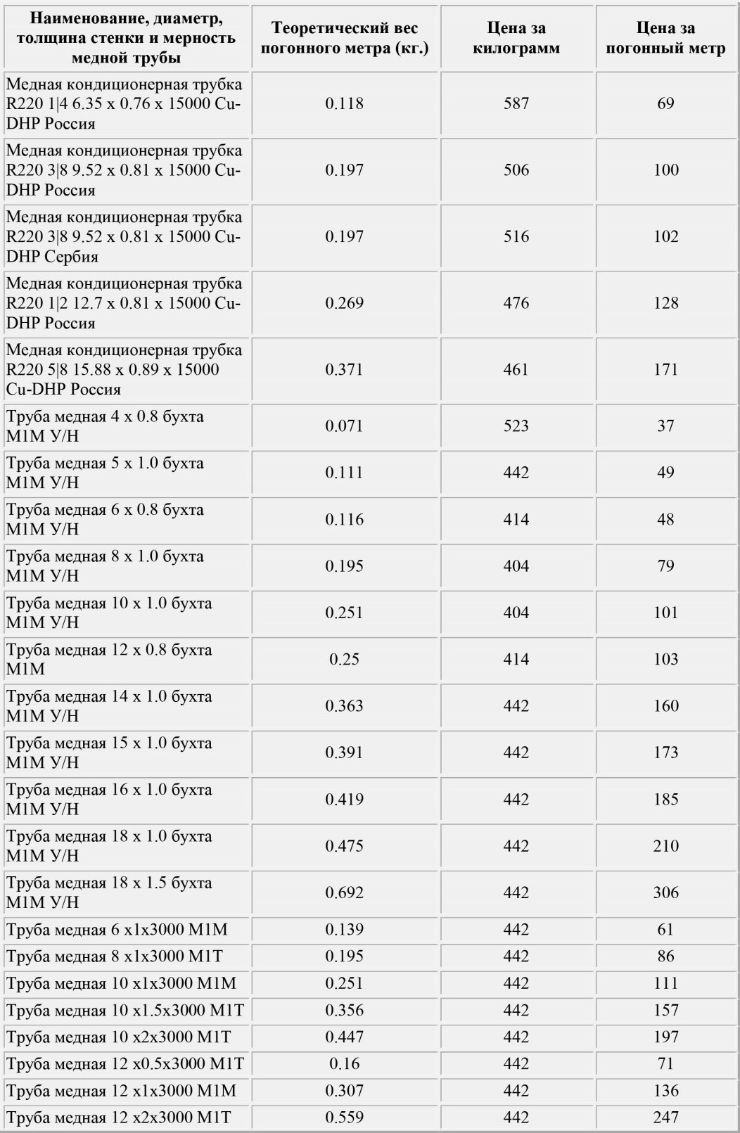 Стоимость таких трубок зависит от сечения, толщины стенки, сорта меди и иных факторов. Средняя цена на медные трубы и фитинги начинается от 415 р./кг. По метражу – от 200 р./м. п.