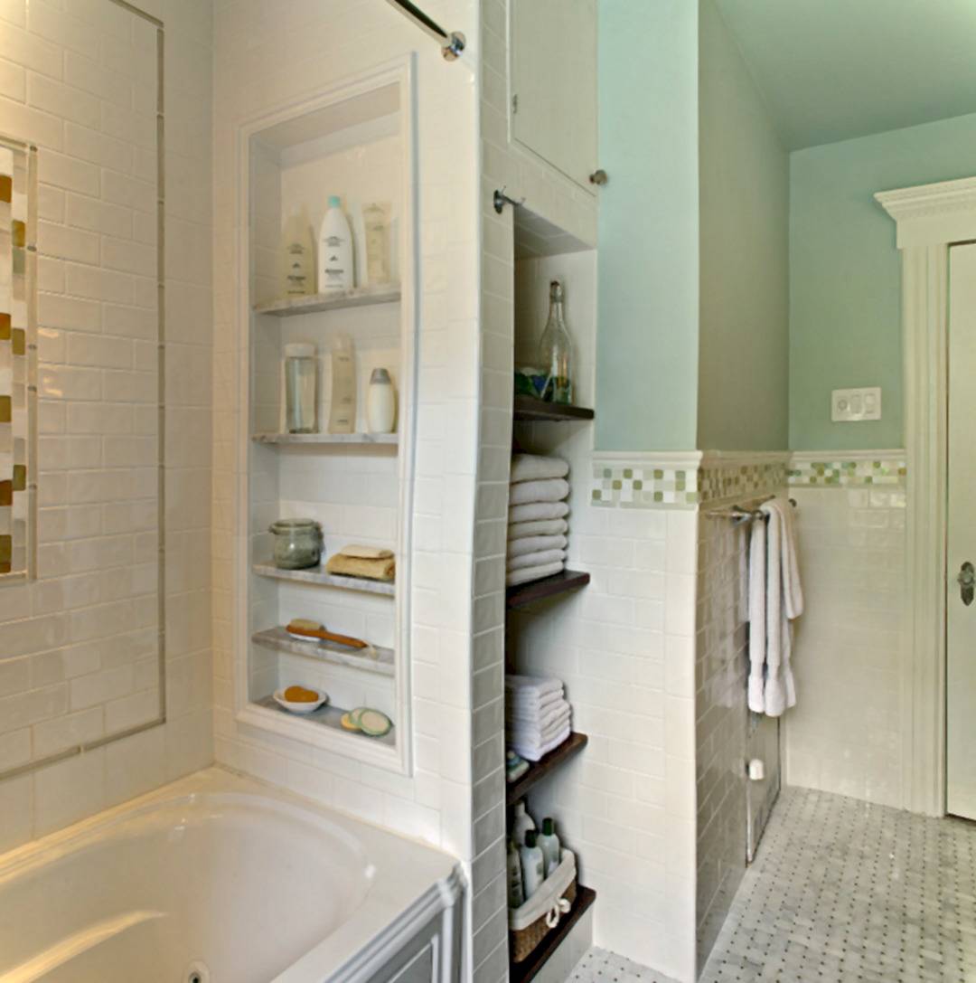 Встроенные – это такие полки, которые формируются в ранее существующей или специально сооружённой нише. Более глобальное сооружение, которое является частью ванной комнаты.