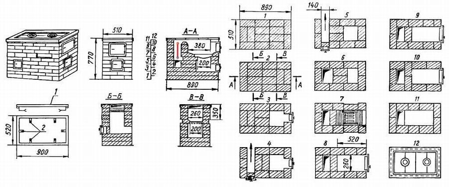 Ниже представлена схема укладки такого рода печки. Такой вариант представляет собой самую простую кирпичную конструкцию. Стандартная ширина, высота и длина соответствуют размерам 510х910х 1010мм. Возводят подобную конструкцию на кухне у одной стен или посередине помещения. В случае расположения у стены обогревается не только кухня, но и соседняя комната. Топочная дверца может быть изготовлена из чугуна или жаростойкого стекла.