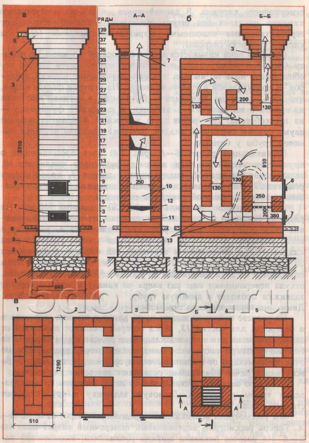 Рис. 6. Отопительная печь размером 510×1290 мм  а — фасад; б — разрезы А—А; в — кладка 1 —5 рядов; 1 — фундамент в грунте; 2 — грунт; 3 — дымовая задвижка; 4 — разделка; 5 — потолочное перекрытие; 6 — топочная дверка; 7 — поддувальная дверка; 8 — гидроизоляция; 9 — наружный фундамент; 10 — топливник; 11 — зольниковая камера; 12 — колосниковая решетка; 13 — отверстия для чистки