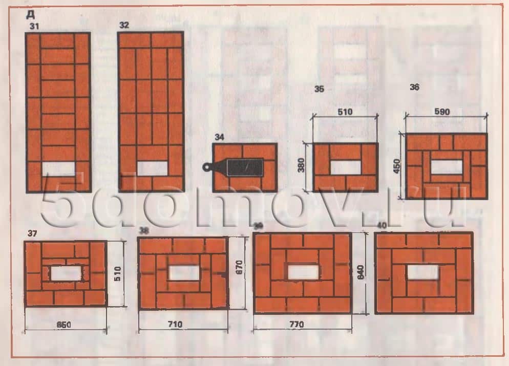 и собственно кладка (кирпич выкладывается слой за слоем горизонтально, с детальной распиской мест размещения элементов оснастки); и тип печной конструкции (печка-порядовка, у которой каждый слой связан с размещением какого-либо элемента).