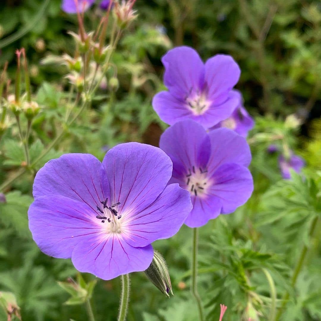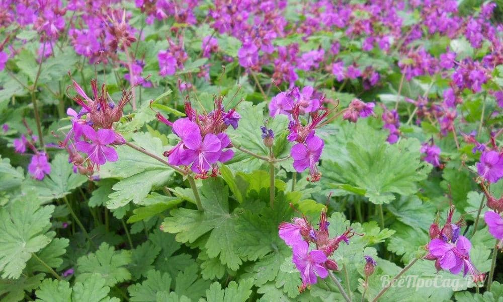 Начало мая и все лето — сезон цветения садовой герани. Высота многолетника составляет 80-90 см. Групповые соцветия из мелких цветков радуют глаз всеми оттенками фуксии, синего и пурпурного. После увядания цветов наступает черед ярких листьев герани, которые украшают клумбы до самого снега.