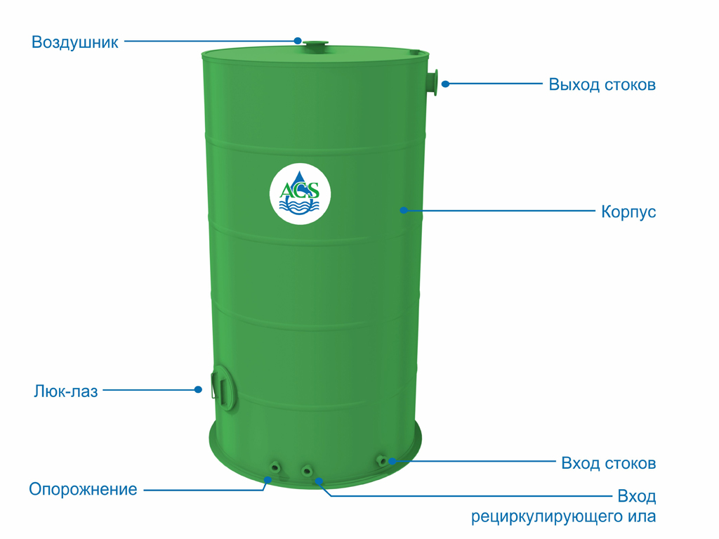 Описание: Блок анаэробного реактора представляет собой вертикальную цилиндрическую емкость, оборудованную системой смешивания поступающих на очистку сточных вод и рециркулирующей иловой массы. Рециркулируемая иловая смесь из блоков биологической очистки второй ступени непрерывно возвращается в блок анаэробного реактора, где обеспечивается ее анаэробная обработка, денитрификация, и перевод трудно окисляемых веществ в доступные для последующих ступеней очистки формы.