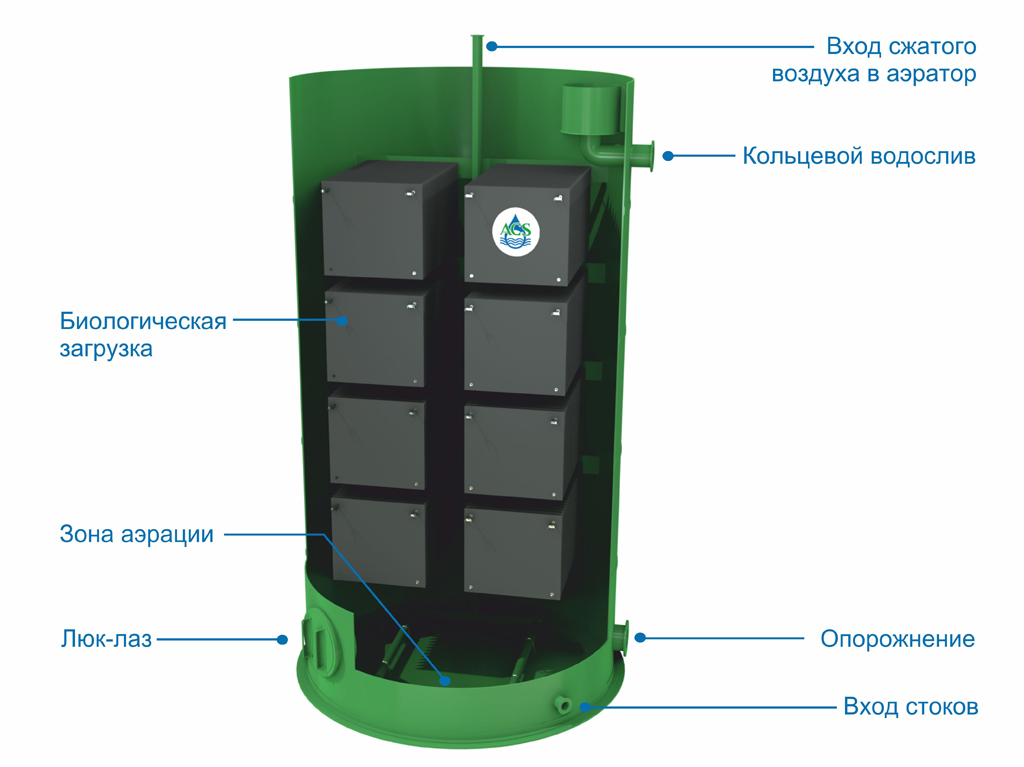 - Биологическая очистка с помощью микроорганизмов активного ила в блоках биологической очистки. В блоках размещено специальное оборудование, обеспечивающее биологическую очистку сточных вод. В анаэробных и аэробных зонах блоков установлена технологическая загрузка, на которой непрерывно развивается активная иммобилизованная биомасса. Отстойные зоны блоков оборудованы тонкослойными модулями и эрлифтами, обеспечивающими рециркуляцию активного ила. Наличие в блоках биологически прикрепленной и взвешенной активной биомассы создает условия для эффективного и устойчивого процесса биологической деструкции органических загрязнений и нитрификации солей аммонийного азота. Установленные в аэробной зоне микропористые полимерные аэраторы насыщают иловую смесь в этой зоне растворенным кислородом и обеспечивают эффективное перемешивание активного ила и сточных вод с непрерывной рециркуляцией иловой смеси в кассетах с затопленной технологической загрузкой. В результате биологической очистки в блоках удаляется основная масса органических загрязнений, и сточные воды очищаются от азотистых соединений